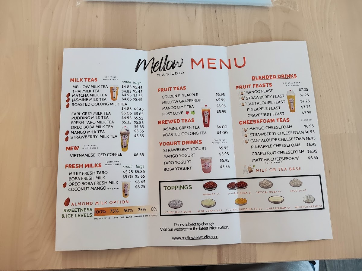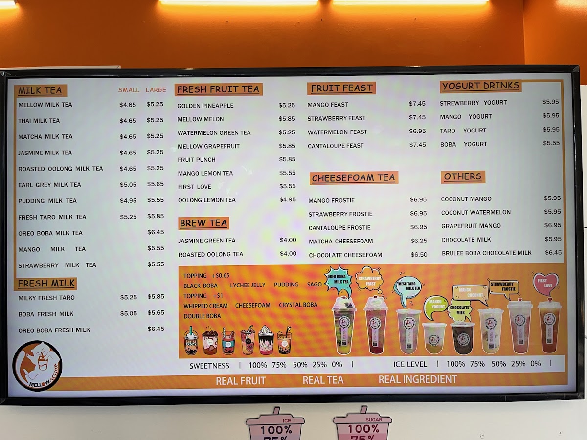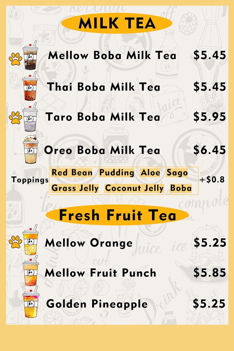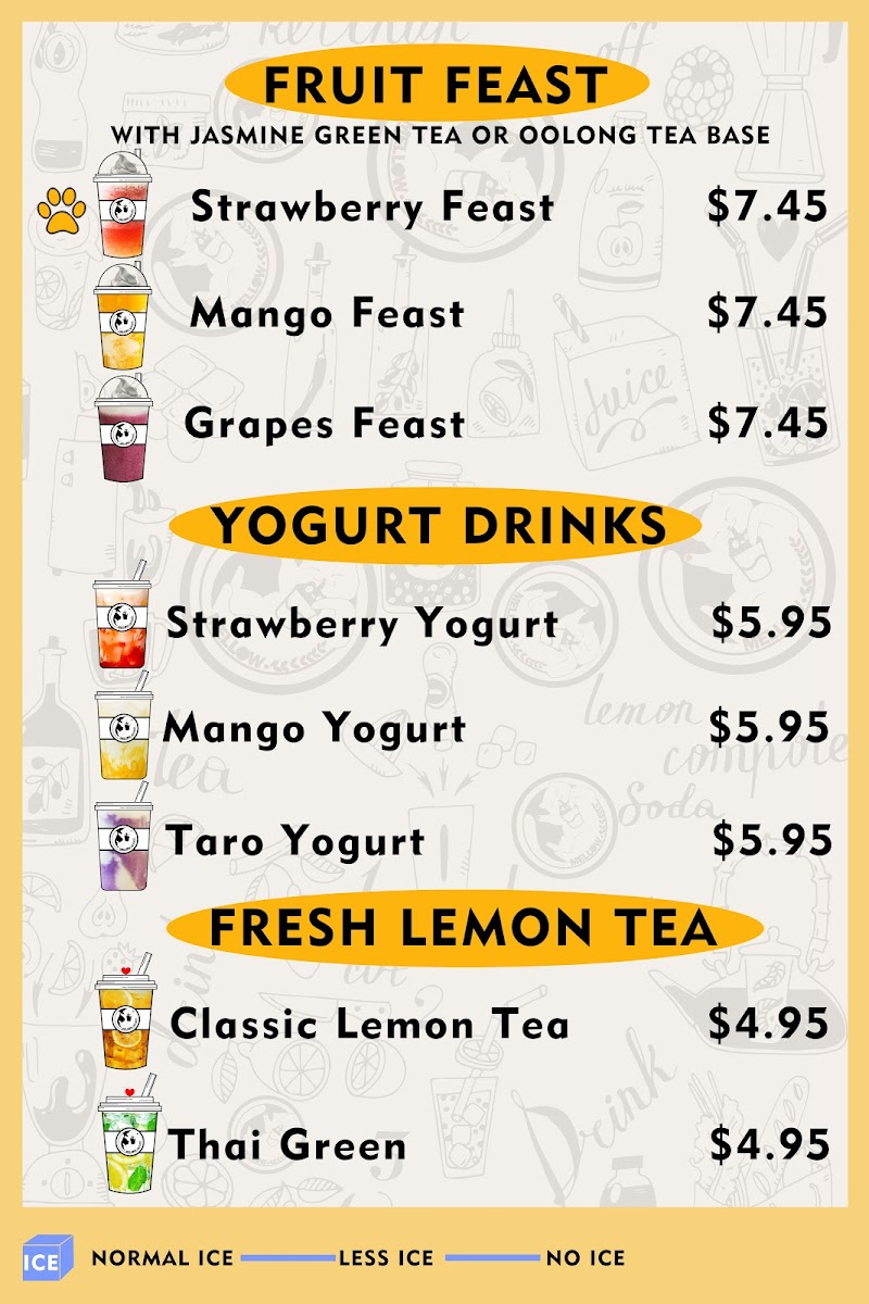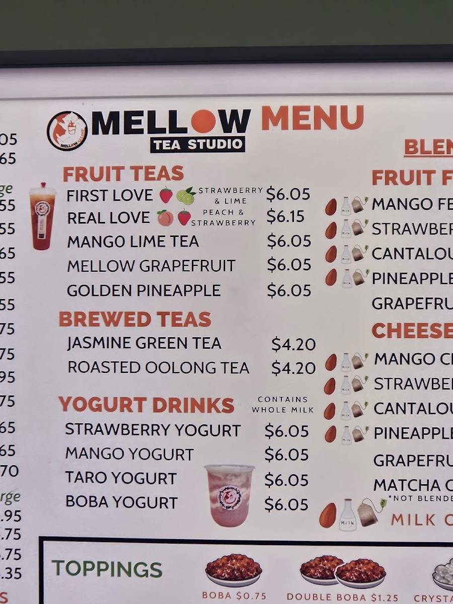 From a reviewer’s perspective, the menu at Mellow Tea Studio offers a colorful and well-rounded selection of drinks that cater to both classic milk tea lovers and those looking for fruity, refreshing options. The Fresh Fruit Tea selection includes favorites like Real Love, First Love, and Golden Pineapple Mango Lime Tea, while the Yogurt series features creamy choices such as Taro Yogurt, Strawberry Yogurt, Mango Yogurt, and Boba Yogurt. For milk tea fans, the Milk Tea lineup offers popular picks like Matcha Milk Tea, Mango Milk Tea, Pudding Milk Tea, Oreo Boba Milk Tea, and Earl Grey Milk Tea. The Fruit Feast options, including Pineapple Feast, Pina Colada, Mango Feast, Strawberry Feast, and Cantaloupe Feast, are perfect for those wanting a more indulgent fruit drink. Lighter options like Roasted Oolong Tea Only and Jasmine Green Tea Only are available under Fresh Brewed Tea, while the Cheesefoam Tea menu highlights unique blends such as Mango Cheesefoam, Strawberry Cheesefoam, Pineapple Cheesefoam, Cantaloupe Cheesefoam, and Matcha Cheesefoam. Finally, the Fresh Milk section includes rich choices like Brown Sugar Boba Fresh Milk, Milky Fresh Taro, Oreo Boba Fresh Milk, and Mango Coconut, rounding out a menu that feels both diverse and satisfying.