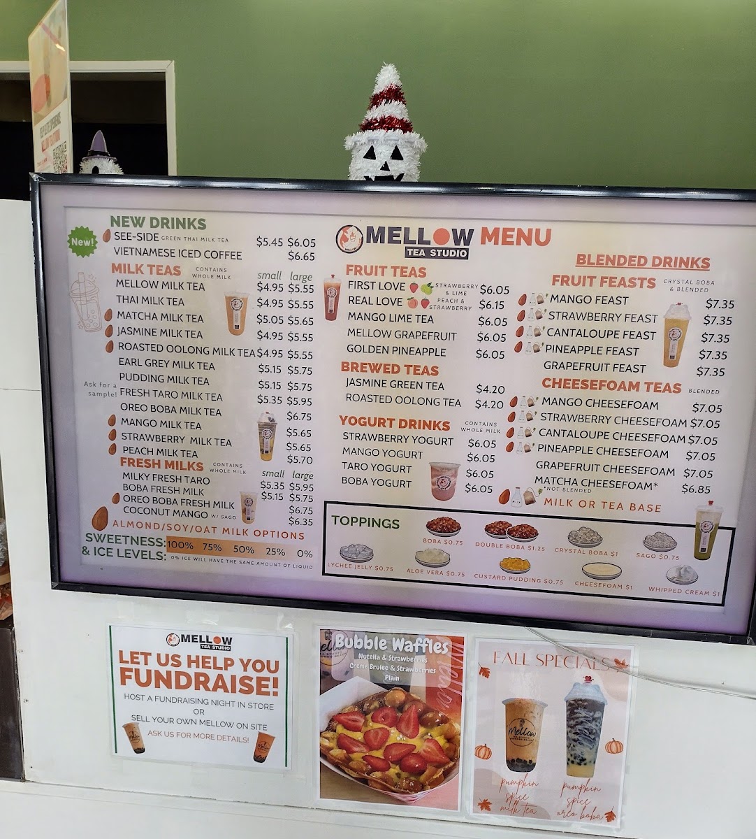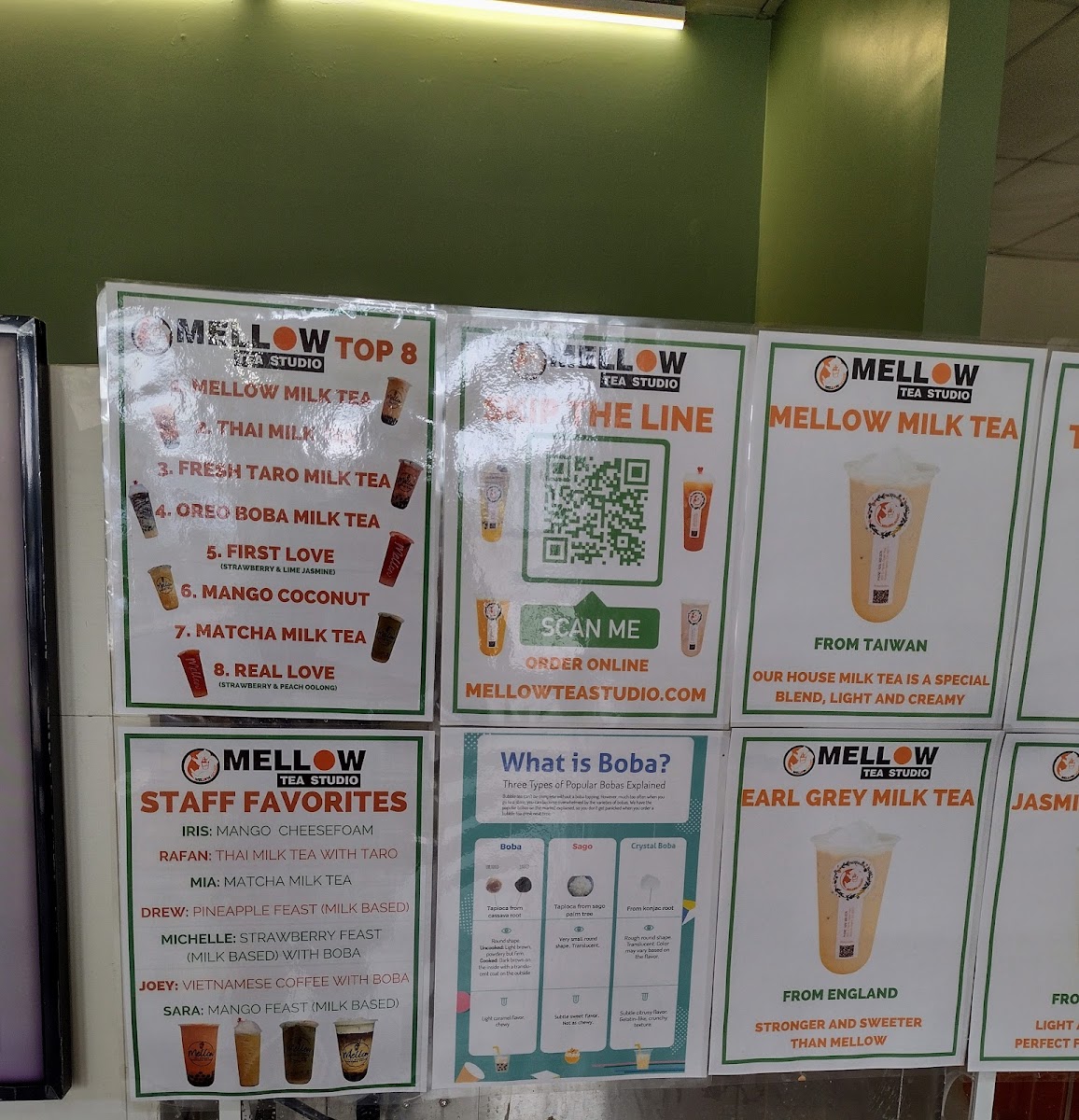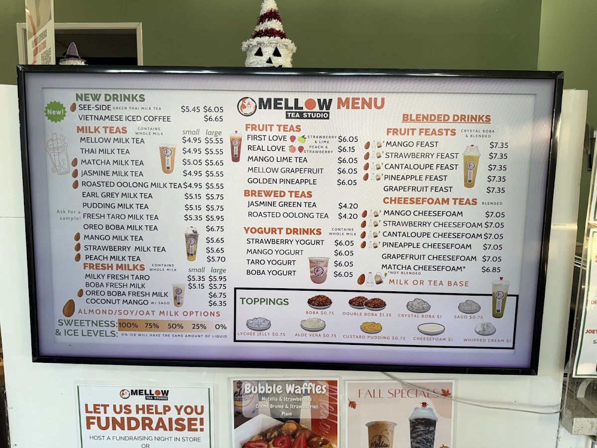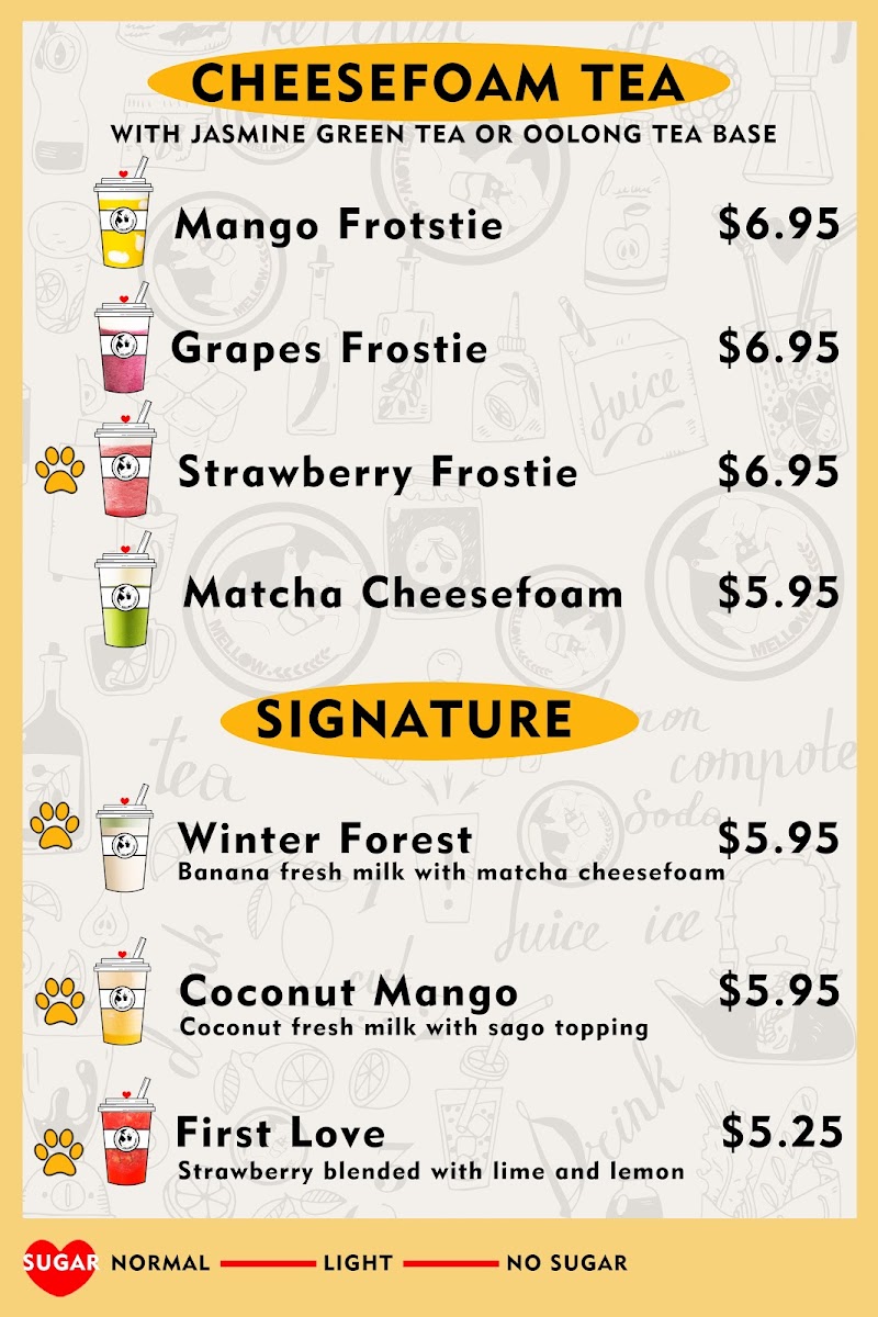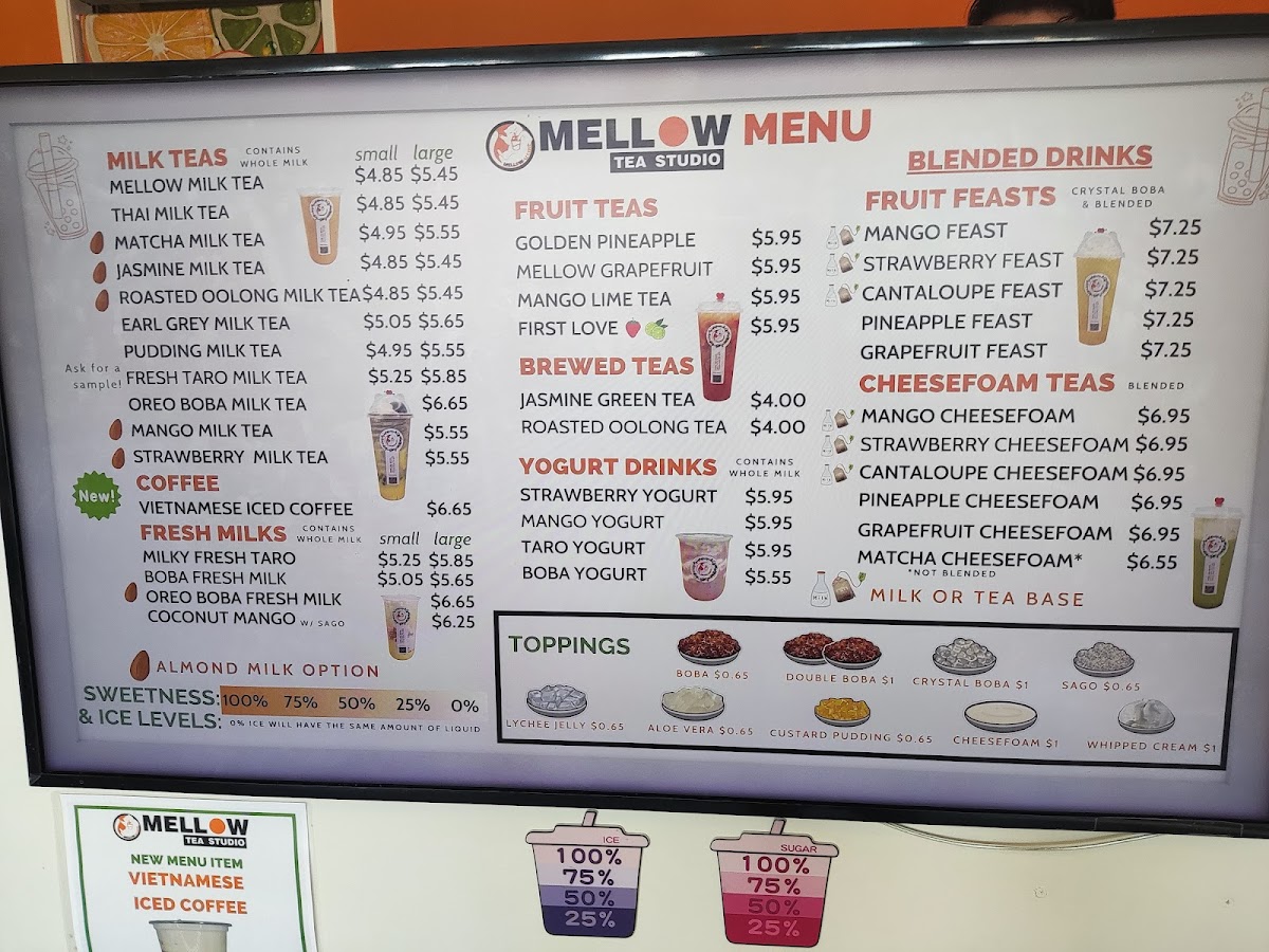 From a reviewer’s perspective, the menu at Mellow Tea Studio offers a colorful and well-rounded selection of drinks that cater to both classic milk tea lovers and those looking for fruity, refreshing options. The Fresh Fruit Tea selection includes favorites like Real Love, First Love, and Golden Pineapple Mango Lime Tea, while the Yogurt series features creamy choices such as Taro Yogurt, Strawberry Yogurt, Mango Yogurt, and Boba Yogurt. For milk tea fans, the Milk Tea lineup offers popular picks like Matcha Milk Tea, Mango Milk Tea, Pudding Milk Tea, Oreo Boba Milk Tea, and Earl Grey Milk Tea. The Fruit Feast options, including Pineapple Feast, Pina Colada, Mango Feast, Strawberry Feast, and Cantaloupe Feast, are perfect for those wanting a more indulgent fruit drink. Lighter options like Roasted Oolong Tea Only and Jasmine Green Tea Only are available under Fresh Brewed Tea, while the Cheesefoam Tea menu highlights unique blends such as Mango Cheesefoam, Strawberry Cheesefoam, Pineapple Cheesefoam, Cantaloupe Cheesefoam, and Matcha Cheesefoam. Finally, the Fresh Milk section includes rich choices like Brown Sugar Boba Fresh Milk, Milky Fresh Taro, Oreo Boba Fresh Milk, and Mango Coconut, rounding out a menu that feels both diverse and satisfying.